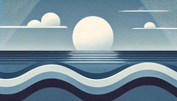 Bathe your senses in the tranquil calmness of a minimalist seascape, captured in the poised interplay of deep blues and pristine whites. Within this artwork, an expansive central orb hangs low, casting a luminous glow that softens the sharp geometric lines of the horizon. Curling waves rendered in flowing, undulating patterns dominate the foreground, while above, sparse clouds float against a subtle gradient sky, enhancing the scene’s serene aesthetic. Drawing inspiration from modern minimalism, each element is intentionally simplified, focusing on form and color to evoke a feeling of peace and orderliness. The stark lines and wave patterns suggest motion and rhythm, making the piece dynamic despite its apparent simplicity. This artwork serves not just as a visual treat but also as a contemporary homage to the natural world, reinterpreted through the lens of geometric abstraction. Perfect for a modern living space or office, the print invites contemplation and calm, promising to be a focal point wherever it resides. *** About Minimalist Art: Minimalist art emerged as a significant movement in the late 1950s, focusing on simplicity and objectivity. By stripping art down to its essential forms and colors, minimalist artists sought to highlight the purity of the artwork, allowing the viewer to engage with it more directly, without distraction. This philosophy of 'less is more' mirrors in various mediums including painting, sculpture, and graphic design, influencing many subsequent art forms. This particular piece exemplifies minimalist art by using simple geometric shapes and a limited color palette to communicate a deeper appreciation of aesthetic harmony and sensory restraint.
