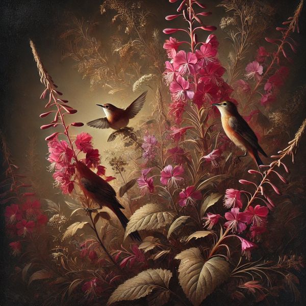 Title: Enchanting Depiction of Fireweed and Birds in a Baroque-style Artwork Photo ID: 54221