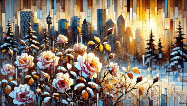 Title: Enigmatic Winter Roses Against Calgary’s Urban Skyline