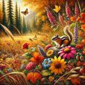 Enchanting Alberta Autumn: Chipmunks Amongst Colorful Blooms and Tall Pines