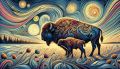 Vibrant Artwork Featuring a Bison and Calf in a Stylized Alberta Landscape