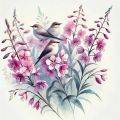Serene Watercolor of Birds Perched on Blooming Fireweed Flowers