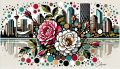 Vibrant Wild Roses Against Calgary Skyline: A Cubist Perspective
