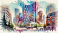 Vivid Watercolor Rendition of Calgary’s Iconic Bow Building Amidst Cityscape