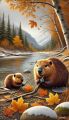 Autumn Serenity: Mother Beaver and Kit Amidst a Snow-Fringed Alberta Creek