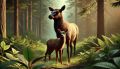 Majestic Elk and Young Calf Stand Amid Lush Forest Under Morning Light