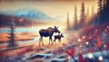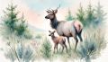 Gentle Pastel Watercolor of Elk and Cub in a Serene Meadow